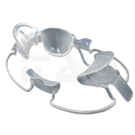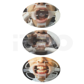 Apribocca/retrattore elastico opaco con dispositivo per il bloccaggio della lingua e divaricatori per labbra e guance.