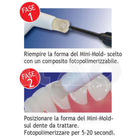 • Utilizzare adesivo fotopolimerizzabile (Riempire la forma del Mini-Mold™ scelto con un composito fotopolimerizzabile e posizionare la forma del Mini-Mold™ sul dente da trattare. Fotopolimerizzare per 5-20 secondi.)