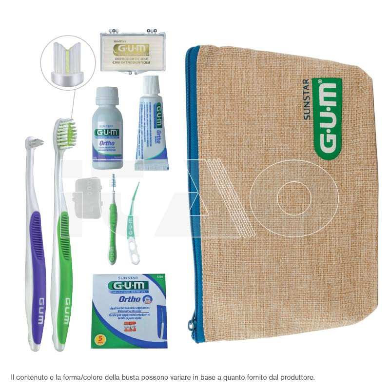 Pratica bustina in lino eco-frinedly, contenente un set completo per l'igiene in ortodonzia.