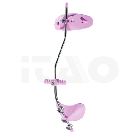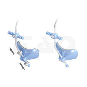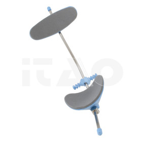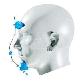 Realizzata in acciaio inossidabile e materiali plastici resistenti alle rotture. Completamente regolabile, può essere facilmente adattata al viso del paziente. Appoggio frontale basculante e mentoniera fissa o articolata. Rivestimento mentoniera e frontale in materiale morbido per il massimo comfort del paziente. La maschera può essere utilizzata con mentoniera in posizione fissa o articolata.
