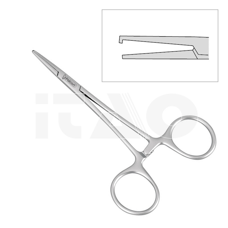 Pinza Mosquito satinata, antiriflesso, con dentino o scanalatura per favorire la trattenuta della legatura elastica.