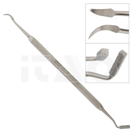 • Dotato di una estremità zigrinata per adattare le bande e una tagliente per rimuovere eccessi di cemento o adesivo